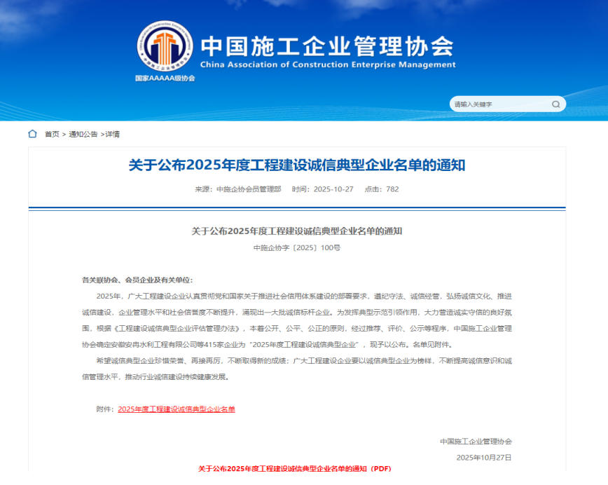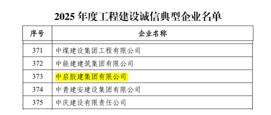 近日,中国施工企业管理协会公布“2025年度工程建设诚信典型企业”名单。中启胶建集团有限公司凭借长期以来诚信经营、合规管理及品质服务等方面的突出表现,成功获评“2025年度工程建设诚信典型企业”。获得工程建设诚信典型企业,标志着公司在工程建设领域的诚信、专业能力和社会责任得到了行业的广泛认可,增强了公司的信誉度和公信力。对公司长远发展和业务扩展具有积极的促进作用。