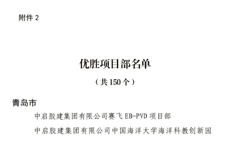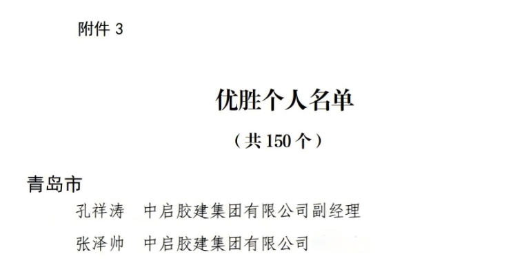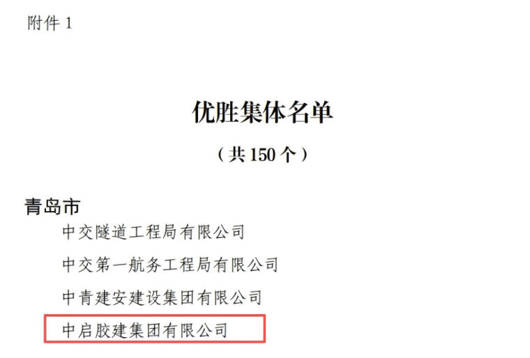 12月10日,山东省住房和城乡建设厅官网公布了2025年度全省住房城乡建设系统重点工程创新创优劳动竞赛获奖名单,中启胶建集团有限公司荣获“优胜集体”称号,赛飞 EB-PVD 项目部和中国海洋大学海洋科教创新园区(西海岸校区)智慧海洋楼工程项目部被评为“优胜项目部”称号,华东公司孔祥涛和胶州公司张泽帅评为“优胜个人”称号。